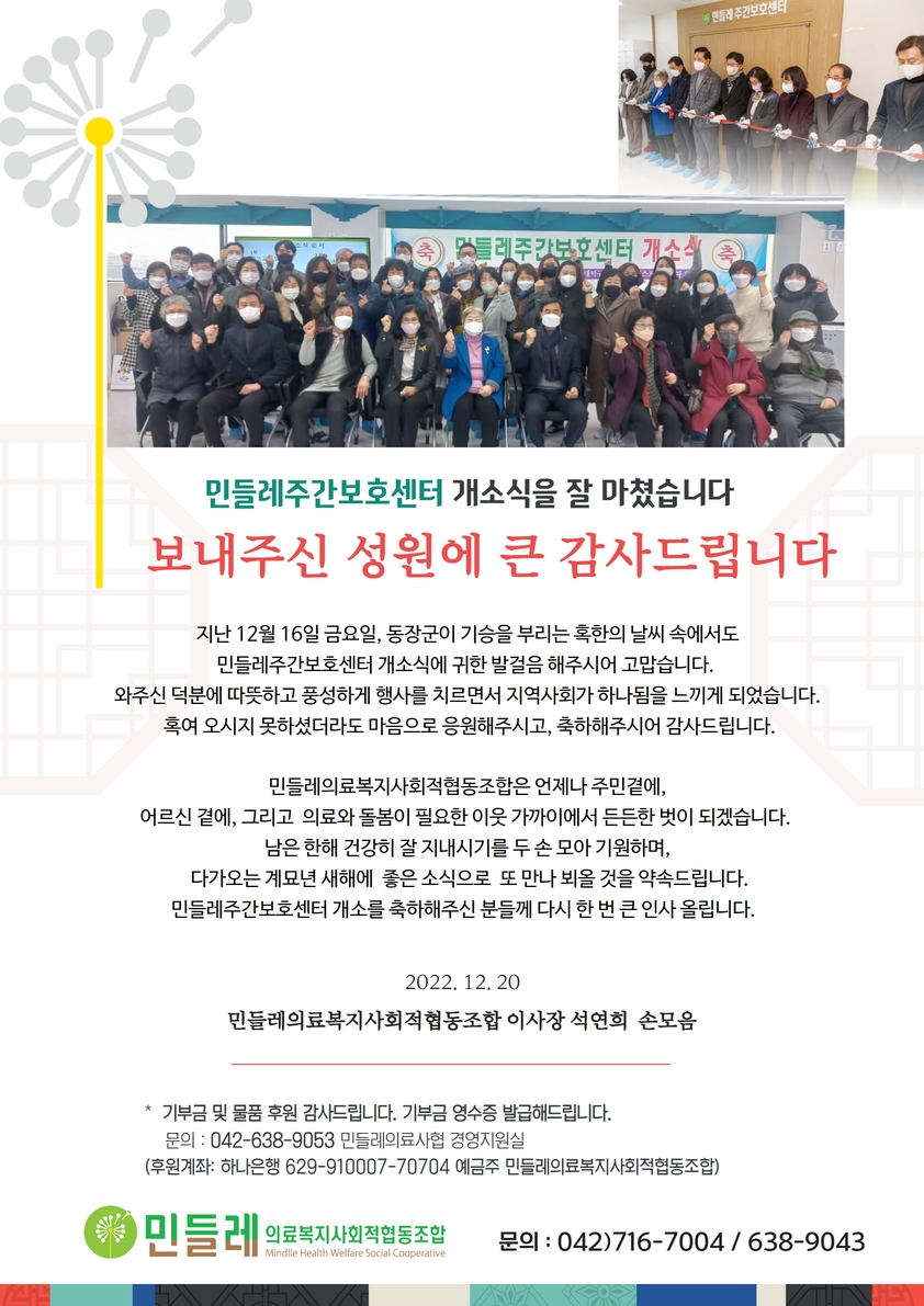 민들레주간보호센터 개소식을 잘 마쳤습니다