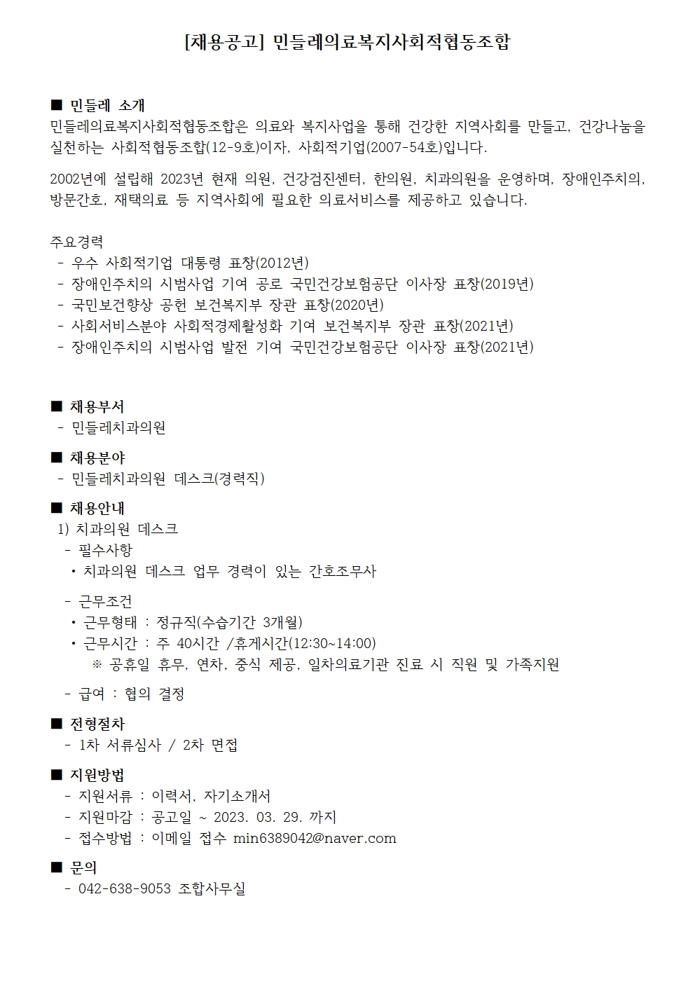 [채용마감]민들레치과의원 간호조무사 채용